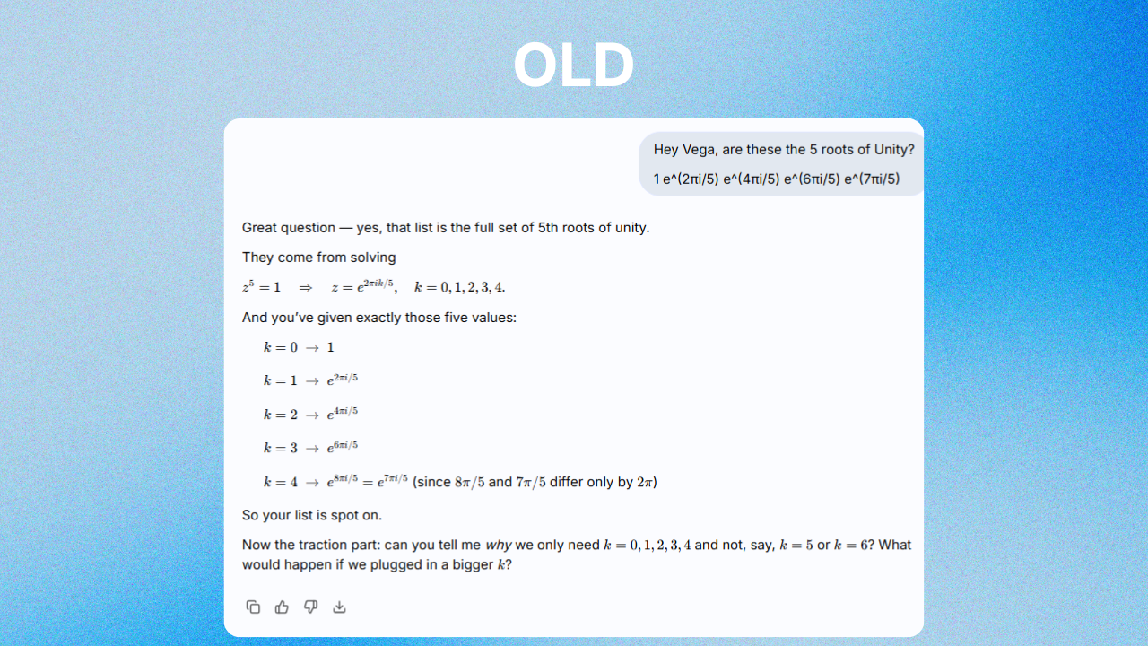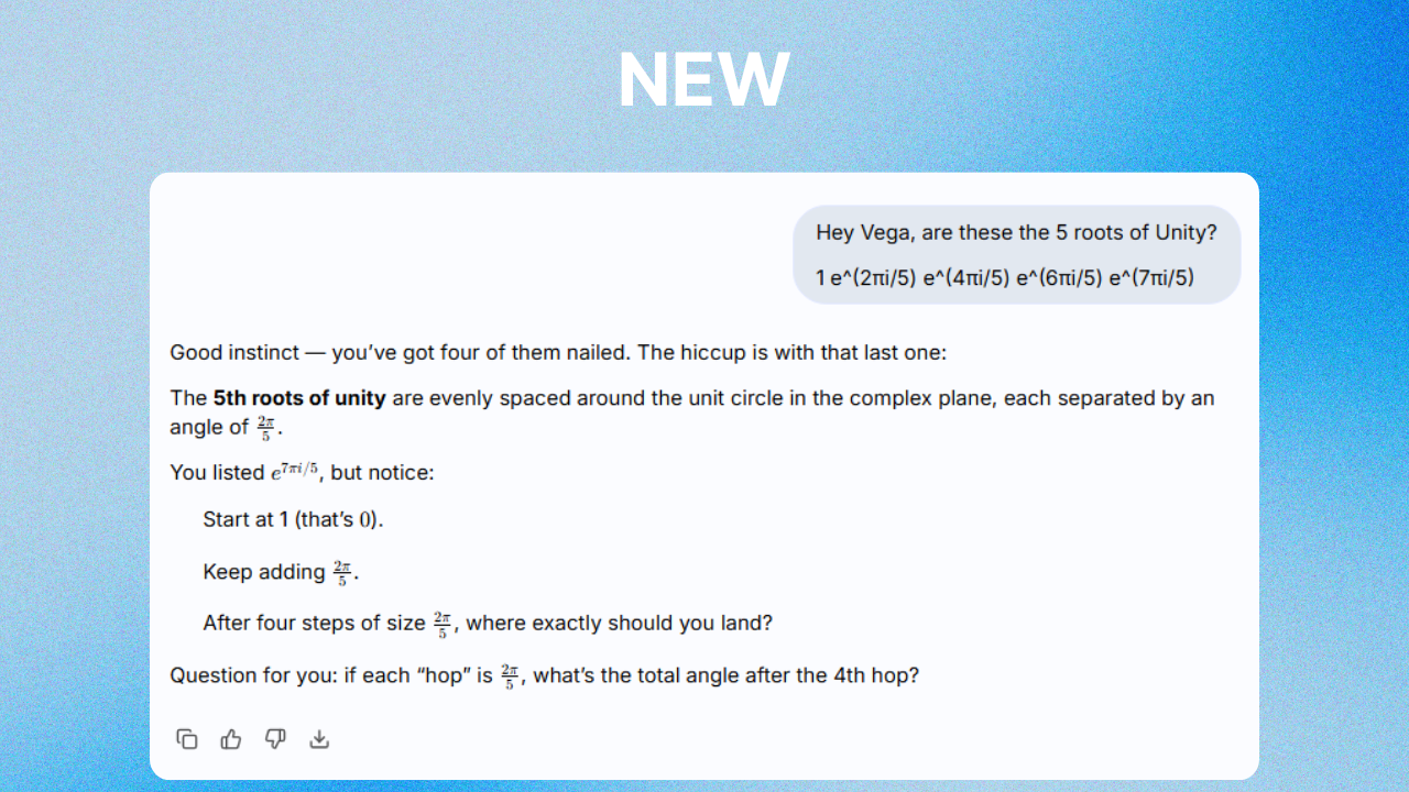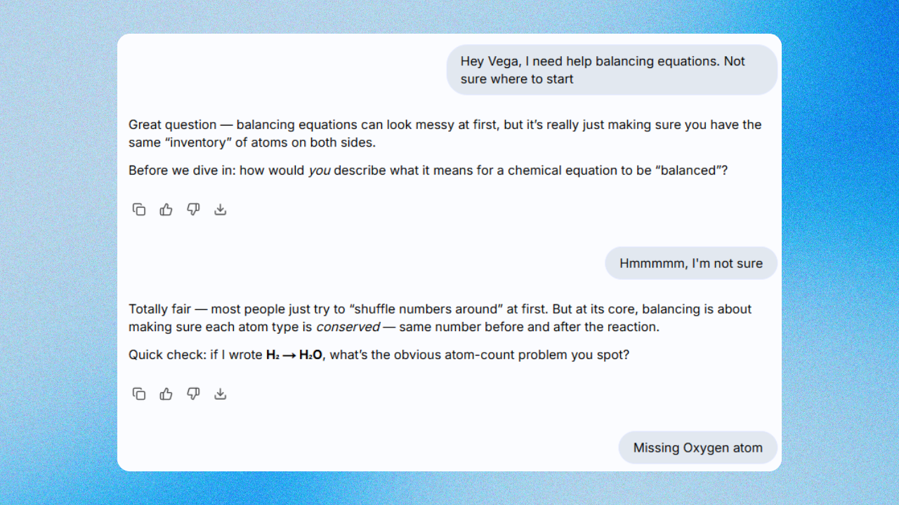 It’s not just about brevity, though. The behavior is more dynamic. Vega now adapts better to the way a student is learning in the moment. Struggling? It slows down. Moving quickly? It keeps pace. It’s the kind of adjustment that makes the difference between reading answers and actually learning. Furthermore, it understands student intent better. Whether you're answering it's question or responding to a previous question, Vega will now understand and respond clearly.